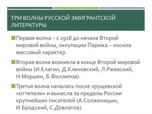 В эмиграции оказался практически весь цвет литературного Серебряного века: З. Н. Гиппиус, К. Д. Бальмонт, В. И. Иванов, В. Ф. Ходасевич, И. В. Одоевцева, М. И. Цветаева и др. Все они продолжали писать, сохраняя традиции дореволюционной литературы XX в.