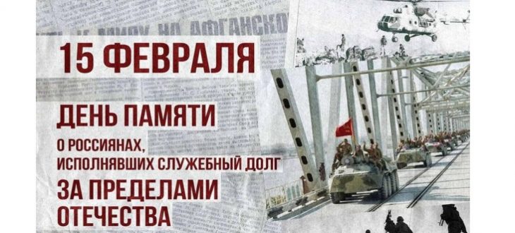 Памятная дата России. День воинов-интернационалистов. День памяти о россиянах, исполнявших служебный долг за пределами Отечества. Официальная памятная дата в Российской Федерации, призванная почтить память воинов-интернационалистов, исполнявших интернациональный долг за пределами границ своей Родины. Дата для проведения была выбрана не случайно. Именно в этот день, 15 февраля 1989 года, последняя колонна советских войск покинула территорию Афганистана.