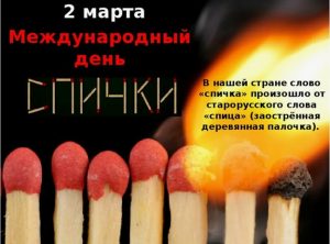 Трудно представить жизнь человека без огня. Он согревает в холод, помогает готовить горячую пищу, создает уют в жилище. Раньше его добывали с большим трудом — трением и высеканием. После появления спички задача упростилась. Этому крошечному, но такому необходимому изобретению человека для добычи огня посвящен отдельный праздник. Возникновение первых спичек датируется 1805 годом. Название пошло от слова «спица», то есть заостренная палочка из дерева.