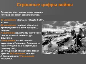Война принесла народу, каждому жителю страны столько горя и страданий, которые, казалось, вынести было нельзя. Но явив миру беспримерное мужество и массовый героизмом, принеся великие жертвы, пережив неисчислимые лишения и страдания, народ устоял. Он сокрушил абсолютное зло – фашизм, спас Отечество и мировую цивилизацию. Великая Отечественная война, начавшаяся трагедией 22 июня 1941 г., закончилась грандиозным триумфом 9 мая 1945 г. Великая Победа, добытая в ней навсегда останется героической вершиной истории нашей страны.