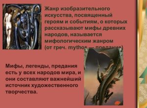 Темой многих мифов являлось объяснение происхождения явлений природы, появления животных и растений. Значительное место в мифологической тематике отводилось героям, наделенных неведомой силой и сражавшихся с многочисленными врагами. В русской мифологии это богатыри – Илья Муромец, Добрыня Никитич, Алеша Попович и другие. У скандинавов-викингов бог Тор сражался с великанами, олицетворением зла. В английских сказаниях Беовульф воевал с драконами и заплатил своей жизнью за победу над Ужасом-Летающим -по-Ночам.