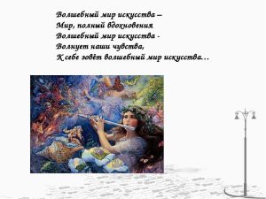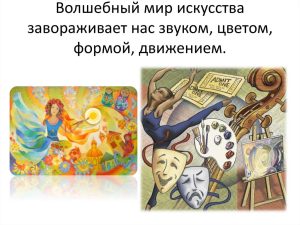 Волшебный мир искусства волнует наши чувства…Действительно, искусство-это праздник души и сердца. Оно занимает одно из значимых мест в нашей жизни.