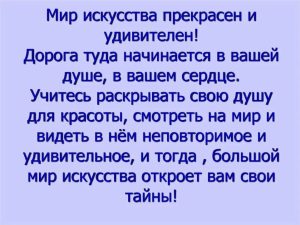 Искусство пробуждает наши чувства, учит любить и ненавидеть, страдать и радоваться; учит отличать добро от зла, красоту от безобразия, истинное от ложного.