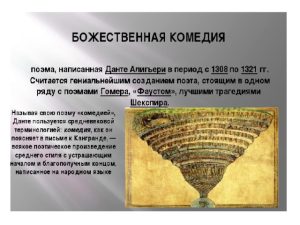 «Божественная комедия» — поэма итальянского писателя Данте Алигьери. Это фундаментальный труд, заложивший основы итальянского литературного языка и оказавший существенное влияние на развитие европейской культуры. «Божественная комедия» Данте Алигьери создавалась им в период изгнания. Работа над поэмой, по мнению большинства исследователей, была начата приблизительно в 1307 году и продолжалась вплоть до смерти поэта в 1321 году. Исторический и культурный контекст создания поэмы неотделим от ее содержания. Данте поместил в загробный мир множество своих современников — римских пап, императоров, политиков, поэтов, — превратив его не столько в теологически‑философский трактат, сколько в злободневное публицистическое произведение, своего рода авторский суд над эпохой.